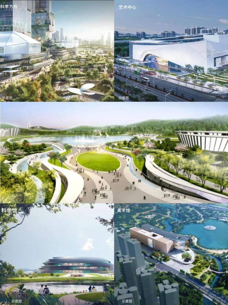 五馆一岛:科技馆(在建)、西方美术馆(在建) 、艺术中心(在建)、书城、科学城体育中心、科学岛(在建)