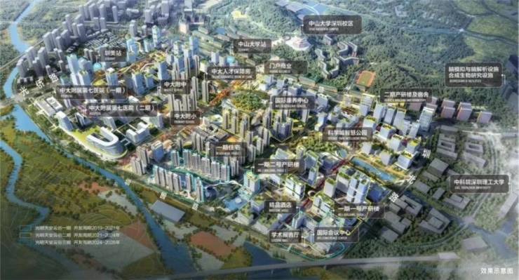 光明布局规划“一心两区”,“一心”即光明中心区,建设科学城的生活服务中心,集聚商业、居住、大型公共服务设施等顶级配套。