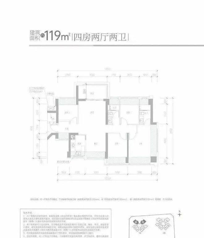 110㎡的4房2厅2卫,设计的是经典竖厅格局,客厅3.8米开间,进门独立玄关,LDKB一体化设计,S墙设计预留冰箱卡槽位,4个卧室分别做到了3.8米/3.2米/2.55米/2.44米的宽度,U型厨房,公卫三段式分离设计,得房率约:95%(包含赠送),客厅连接次卧出6.2米的大阳台,朝西南向。