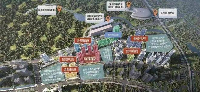 金硕华府,由满京华集团开发,位于光明区光明中心区光辉大道与狮山三街交汇处,项目所在区域是光明规划最宜居,居住小区板块最大的片区,北侧靠近科学公园,东侧及南侧是深圳小学光明学校狮山校区及初中校区,距离最近的6号地铁线“光明站”约800米。