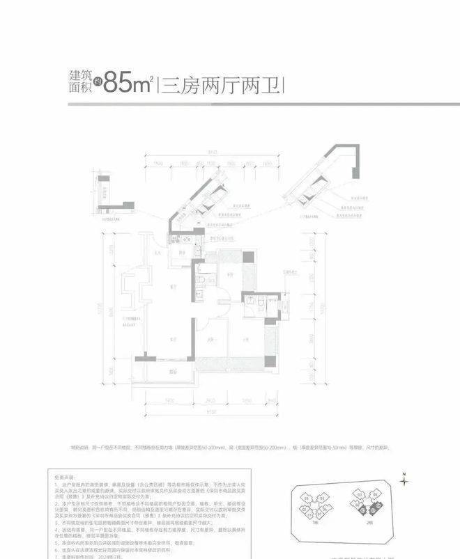 85㎡的3房2厅2卫,设计的经典竖厅格局,客厅3.4米开间,LDKB一体化设计,S墙设计预留冰箱卡槽位,3个卧室分别做到了3.55米/2.6米/2.4米的宽度,U型厨房,公卫三段式分离设计,得房率约:95%(包含赠送),阳台进深1.8米,有西南或东南朝向。
