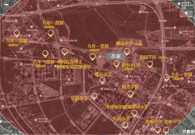 项目东侧在建一所小学(狮山小学),周边还有东周小学、光明小学、华师大附属光明星河小学、修远小学、深圳小学光明曙光学校等;