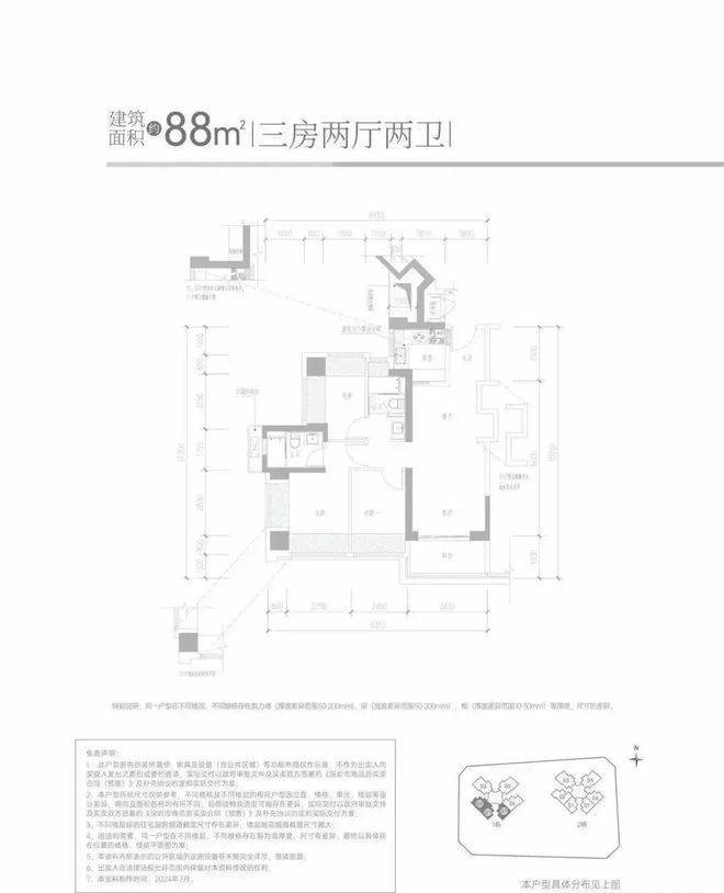88㎡的3房2厅2卫,设计的经典竖厅格局,客厅3.4米开间,LDKB一体化设计,S墙设计预留冰箱卡槽位,3个卧室分别做到了3.55米/2.6米/2.4米的宽度,U型厨房,公卫三段式分离设计,得房率约:95%(包含赠送),阳台进深1.8米,有西南或东南朝向。