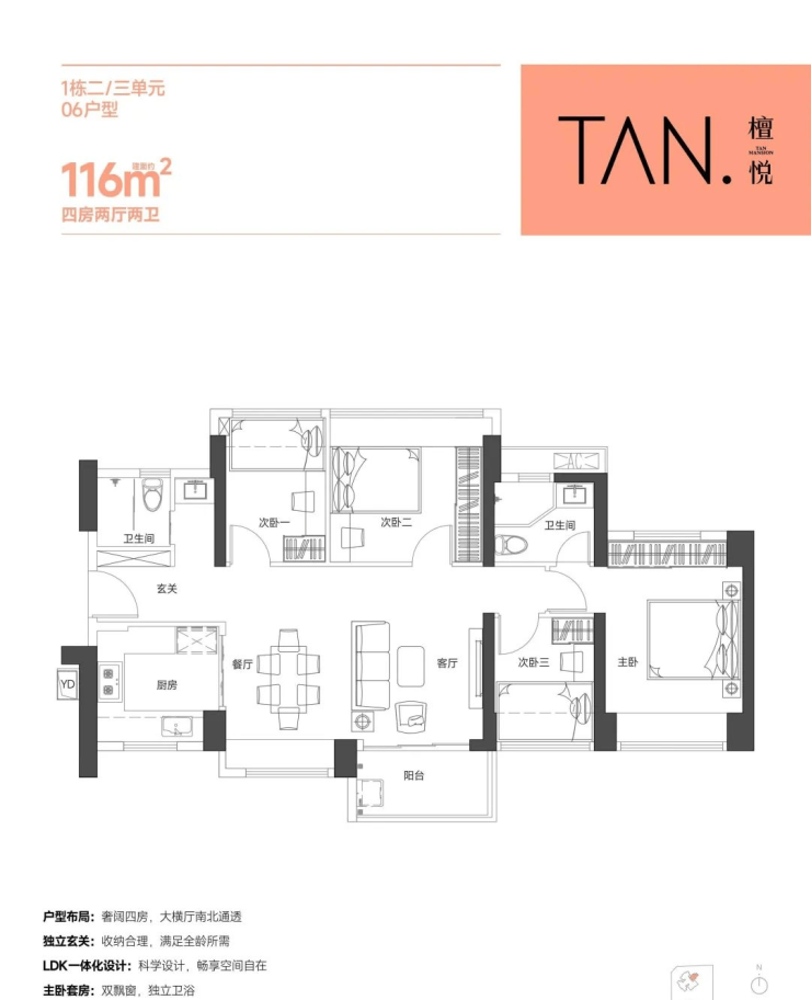 116平:4房2厅2卫,南北通透,使用率74.34%(不包含赠送面积)
