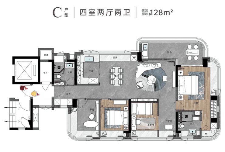【建面约128㎡的4房2卫】