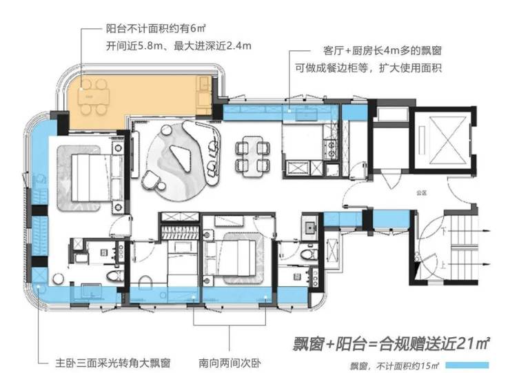 大横厅设计,西南+东北“双朝向”。大横厅设计,三面采光生活更透亮