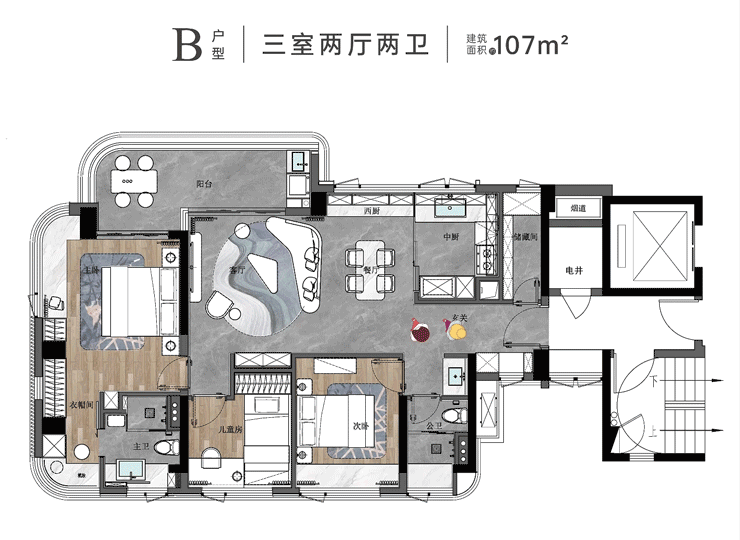 【建面约107㎡的3+1房2卫】