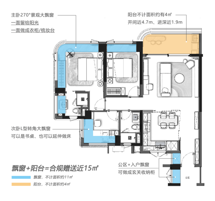 超受欢迎的户型,有巨多飘窗的横厅户型,几乎一整个房子都被飘窗包围。由于飘窗的面积不算在套内,所以这个户型使用率会出奇高。