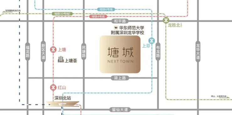 项目位于龙华民治街道上塘,地处深圳几何中心,占位湾区中轴核心。随着2022年深圳都市核心区扩容,民治街道纳入都市核心区,成为与福田-罗湖中心\南山-前海中心并列的深圳第三都市核心区,“数字龙华、都市核心”多重站位部署,龙华未来将建成新一代高密度、高质量、高品质都市核心区。
