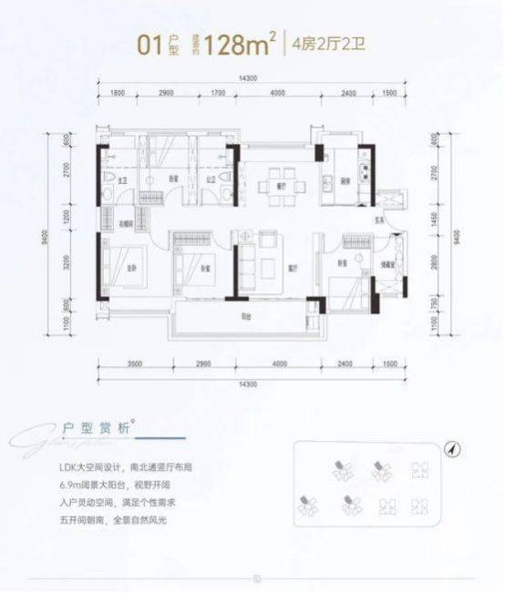 建面约128㎡属于南北通透竖厅格局,客厅进深7.1米(不含阳台),开间4米,配有6.96米宽景阳台,主卧套间设计,配有衣帽间和三段式卫生间。这个户型除通透性比传统横厅更优异外,静区部分的静溢性也会比较好,居住舒适性更佳,受众也是老少皆宜。