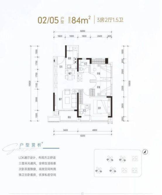 建面约84㎡是传统竖厅动静分区格局,客厅进深7.55米(不含阳台),开间3.4米,主卧8.4㎡(不含主卫和飘窗),空间确实会偏紧凑一点,但没什么硬伤,实用性还是非常不错的。