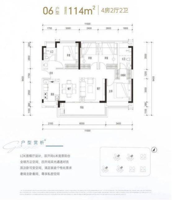 建面约114㎡是传统短进深大开间横厅格局,通透性很好,客厅进深6米,开间4.3米(不含阳台),配有6米宽景阳台,主卧套间设计,配衣帽间和三段式卫生间,这个户型很比较讨喜年轻的购房群体。