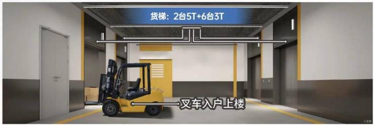 顶配货物运输系统,罕见2*5T+6*3T的高荷载货梯,一流的运载力,叉车入户上楼,垂直运输能力翻倍