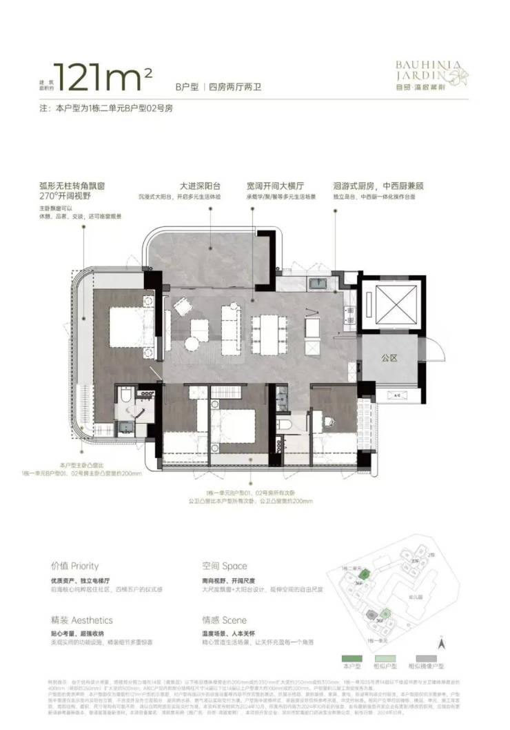横厅四房,东南朝向,空间感开阔,采光通风佳,没有大面积的走廊或过道,节省了空间,动线也更加流畅。主卧拥有更加开阔的景观面,大面积的弧形无柱飘窗,将外部的自然光线引入室内,空间更加明亮宽敞。