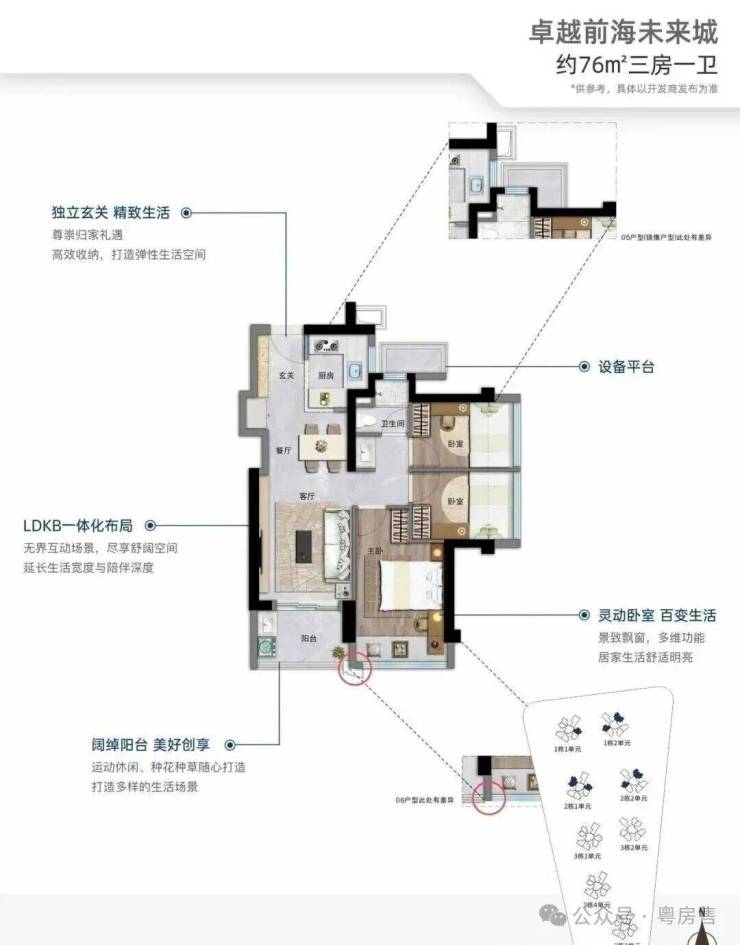 76㎡的3房2厅1卫,设计的是竖厅格局,进门入户玄关,客厅3.05米开间,LDKB一体化,S墙设计预留冰箱位,3个卧室分别做到了2.95米/2.3米/2.15米的宽度,U型厨房,卫生间三段式分离,还带1个设备平台可以使用,得房率约:89%(包含赠送),阳台有朝东北、东南或西南向