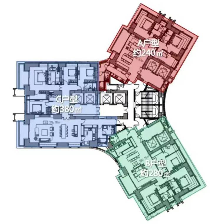 【产品面积段】建筑面积约240-280-380㎡的3-5房