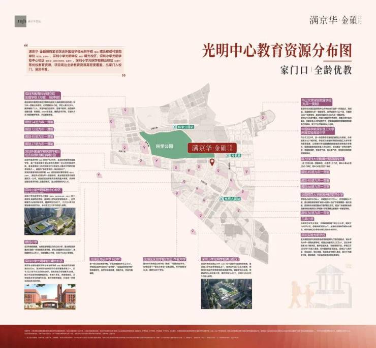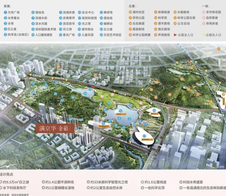 满京华·金硕项目直面占地约208万㎡的科学公园(在建中),近享深圳国际美术馆(暂定名、在建中)、深圳科学技术馆、科学城体育中心(在建中)、会议中心(规划中)等市政级文体配套;还坐拥狮山公园(规划中)、约9.4万㎡的东周文化公园,约10万㎡的开明公园,约56万㎡的新城公园等丰富绿色生态资源。