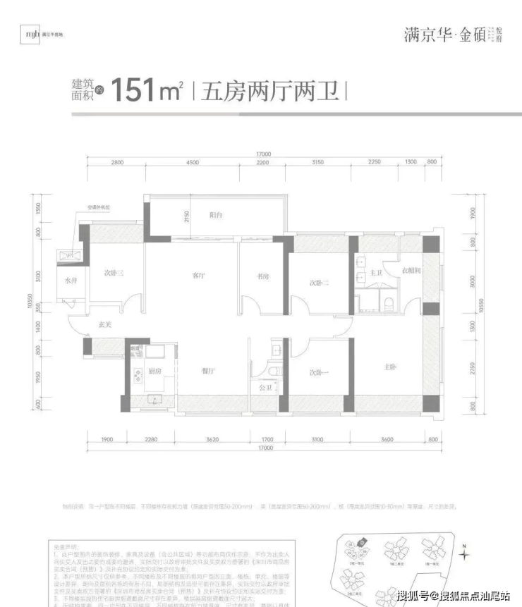 151㎡的5房2厅2卫,设计的是横厅南北通透格局,独门独户,客厅4.5米开间,四开间朝南,4房卧室分别做到了主卧27.44㎡/次卧11.97㎡/次卧11.24㎡/次卧11㎡/次卧8.36㎡(包含墙体飘窗),得房率79.6%(不加赠送),客厅连接次卧出6.7米长的观景大阳台,阳台主朝西北向看科学公园。赠送面积32.09㎡,加上赠送得房率100.84%。