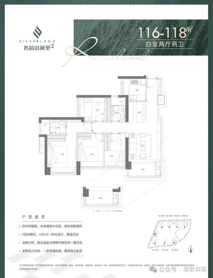 116-118平4房2厅2卫:东南朝向,不含赠送使用率在74%