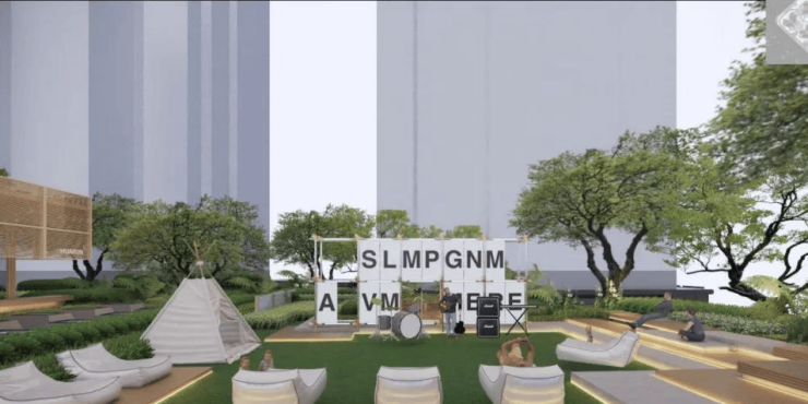 打造元气健身营地空间、自然水岸泳池、达尔文营地游乐场、流水庭院花园等四大主题花园