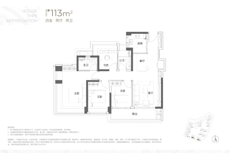 设计的是竖厅双龙抱珠格局,客厅3.5米开间,LDKB一体化,4个卧室分别做到了3.7米/3.4米/2.8米/2.6米的宽度,主卧加2个次卧270°全景飘窗,客厅连接次卧出6.1米长的大阳台,U型厨房,得房率约95-97%(包含赠送),西南或东南朝向。