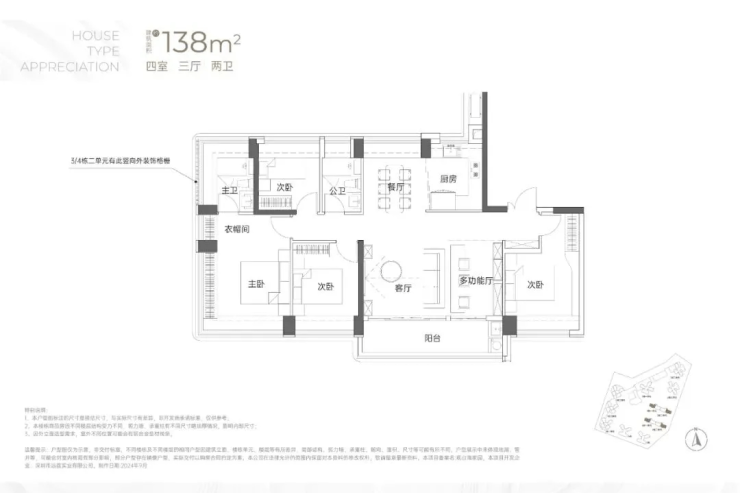 设计的是横厅南北通透格局,客餐厅6米开间,LDKB一体化,全屋飘窗,4个卧室分别做到了3.9米/3米/2.8米/2.6米的宽度,主卧加1个次卧270°全景飘窗,客厅出6米长的大阳台,L型厨房,得房率约95-97%(包含赠送),西南或东南朝向。
