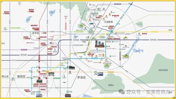 · 湾东智芯:大运新城作为龙岗区“一芯两核多支点”战略的“湾东智芯”,将打造文体辉映、往来便捷、产城融合的高水平东部中心,比肩深圳前海、深圳湾总部基地及香蜜湖等国际会客厅,缔造继福田、南山之后的深圳第三极。