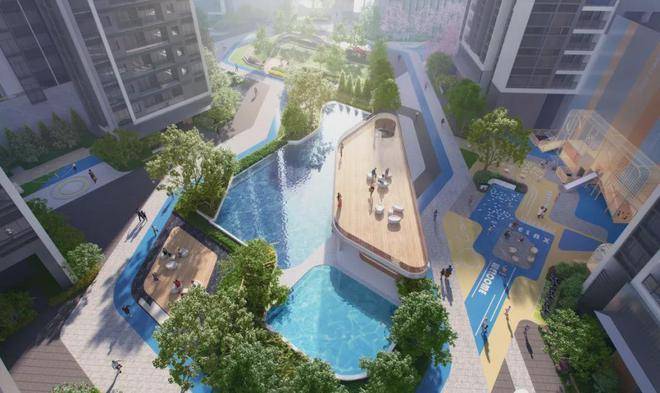 多元交互园林:空中运动花园、全龄亲子双游泳池、环氧跑道、稚趣IP乐园、城市会客厅等,亲子、社交、远动一应俱全;