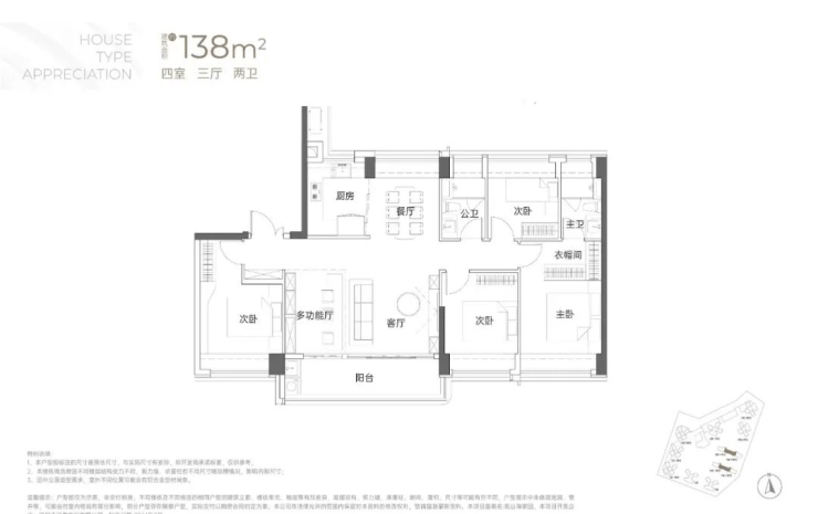 138㎡的4房2厅2卫:竖厅南北通透格局,专梯入户,客厅6.1米开间,LDKB一体化,全屋飘窗,4个卧室分别做到了3.9米/3.25米/2.9米/2.8米的宽度,主卧加1个次卧270°全景飘窗,客厅出6.1米长的大阳台,U型厨房,得房率约95-97%(包含赠送),阳台主朝西南向。138平米户型分布在3栋1单元、3栋2单元、4栋1单元、4栋2单,4个单元纯大户型。