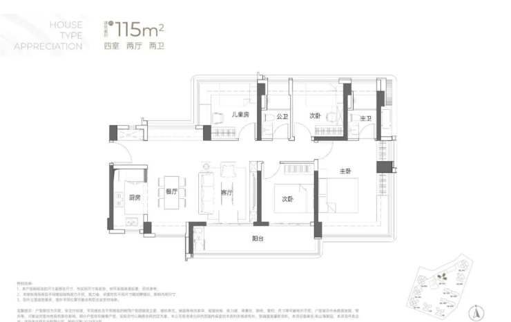 115㎡的4房2厅2卫:横厅南北通透格局,客餐厅6米开间,LDKB一体化,全屋飘窗,4个卧室分别做到了3.9米/3米/2.8米/2.6米的宽度,主卧加1个次卧270°全景飘窗,客厅出6米长的大阳台,L型厨房,得房率约95-97%(包含赠送),西南或东南朝向。115平米户型分布在1栋1单元、1栋2单元、1栋3单元01/02户型,01户型西南朝向都是看小区外围,02户型看向小区;