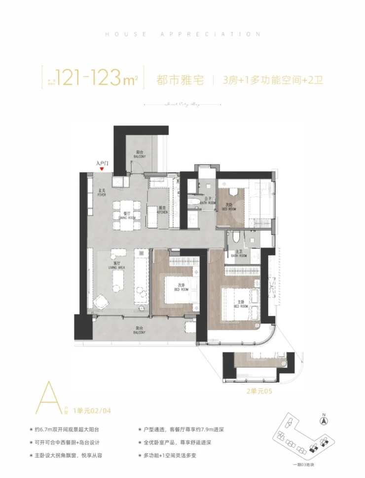 122-124㎡3+1房2厅2卫,有竖厅、横厅和双龙抱珠户型,跟之前03地块户型完全一致。
