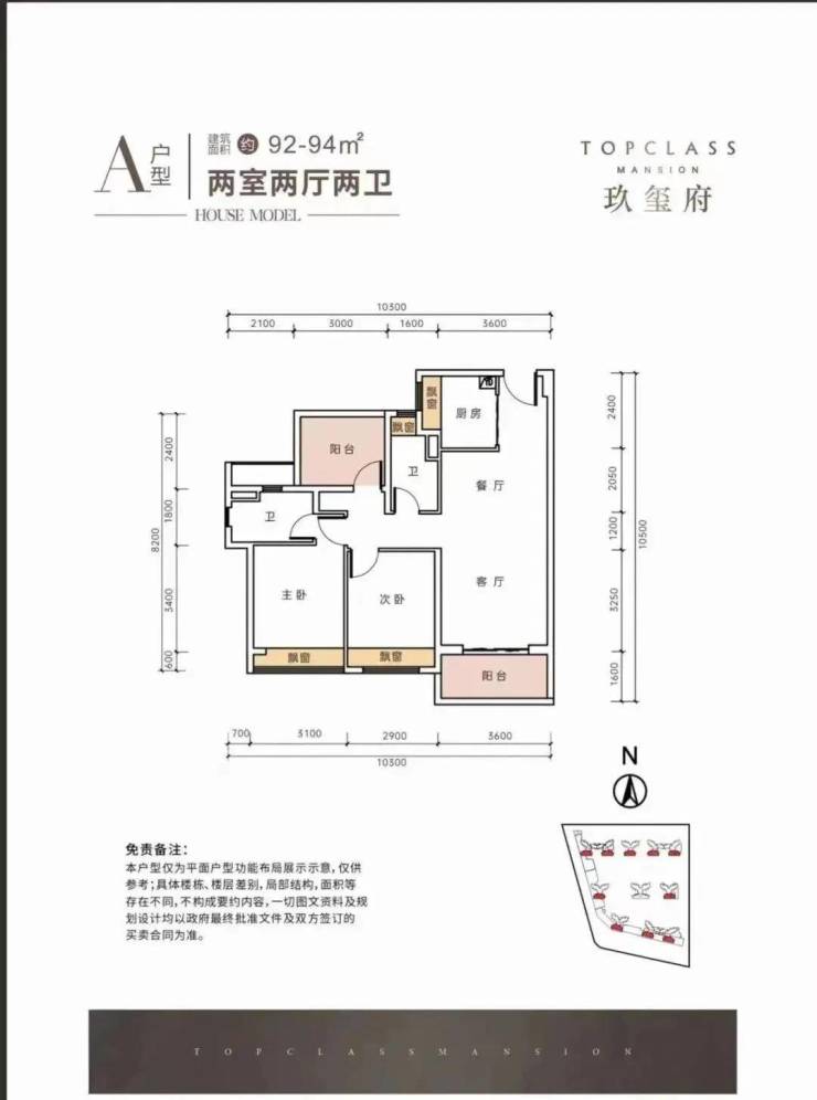 92-94平的3房2厅2卫朝南的户型。(主阳台朝南)