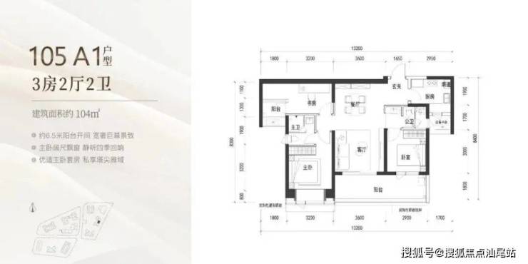 104㎡的3房2厅2卫,A1户型(2栋3单元03户型),设计的是竖厅类双龙抱珠格局,客厅3.6米开间,客餐厅一体化设计,3个卧室分别做到了主卧12.8㎡/次卧12㎡/次卧8.7㎡(包含墙体飘窗),客厅连接次卧出6.5米长的宽景大阳台,U型厨房,公卫三段式分离,得房率约90%(包含赠送),东南朝向。