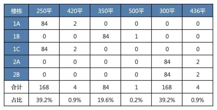 产品分布如下表所示:小区最主力的户型就是250平和300平的大平层,都超过1/3的比例,加上约20%的350平的大户型。