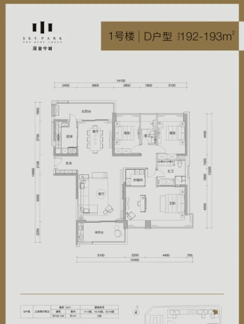 D户型:192-193㎡3房2卫(可改4房),套内面积151㎡,户型与B户型类似,同样享受香蜜公园景观。