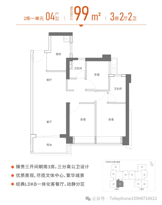 96/99㎡三房两卫:三开朝南-视野好景观佳