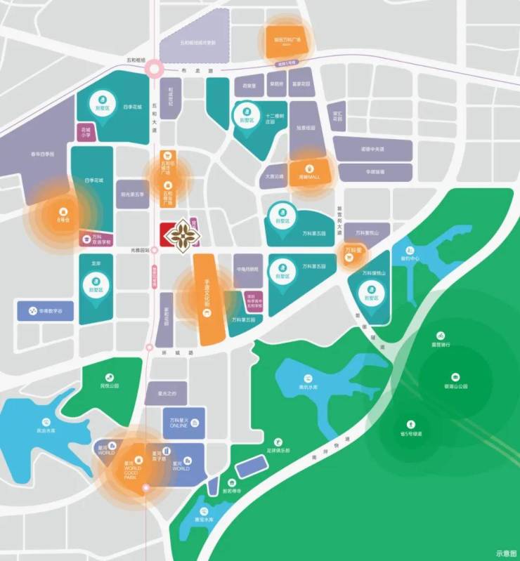 商业方面 1公里范围内有8号仓奥特莱斯及阳光湾畔、五和商业广场等小型商场,距离雅宝星河wordCoCopapk1.6公里,距离天虹商场坂田店1.8公里。
