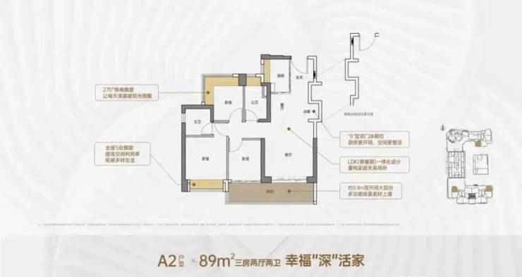 A2户型-约89㎡3房2厅2卫:户型分布在1、2、5单元,阳台南向、东向、西向均有选择。