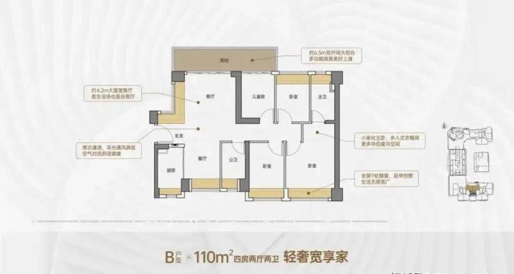 B户型-约110㎡4房2厅2卫:户型分布在1、2单元,竖厅南北通透格局。