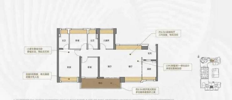 竖厅格局,客厅3.5米开间,LDKB一体化,S墙设计预留冰箱卡槽位,客厅连接次卧出5.9米长的大阳台,主卧双面飘窗,次卧270°转角飘窗,全屋6面飘窗,U型厨房,卫生间干湿分离。