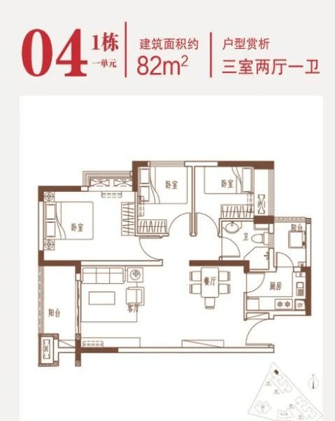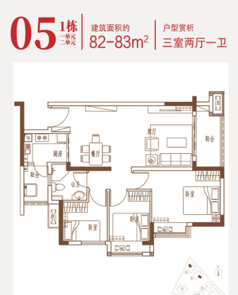 建面约82-83㎡的3房2厅1卫户型,在保证空间尺度感的前提下做到3个房间,实用性高,厅出阳台设计,厨房餐厅客厅衔接,面积更开阔的同时也做到动静分离,公共活动与私密生活互不干扰。一个细心的设计细节是,厨房旁边设计有生活阳台,可以晾衣服,储存清洁用具,保证景观阳台的干净整洁,让室内环境看起来更加井井有条。