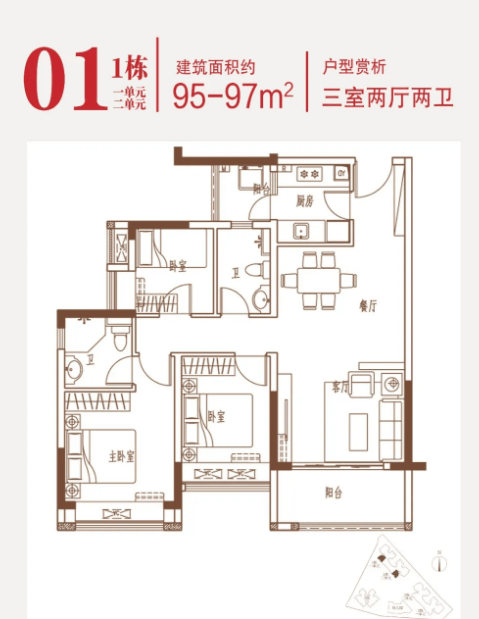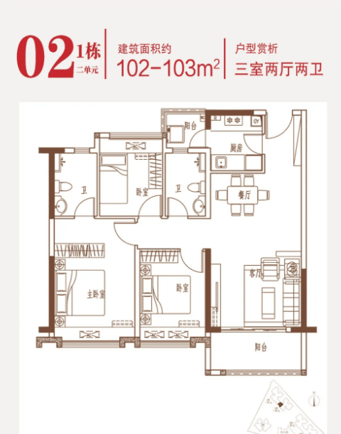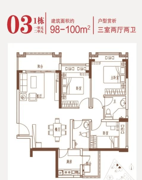 90-102㎡的3房2厅2卫户型。这几个户型都是在主人房多设计一个卫生间,私密性更强,也让家人间的生活更加方便。