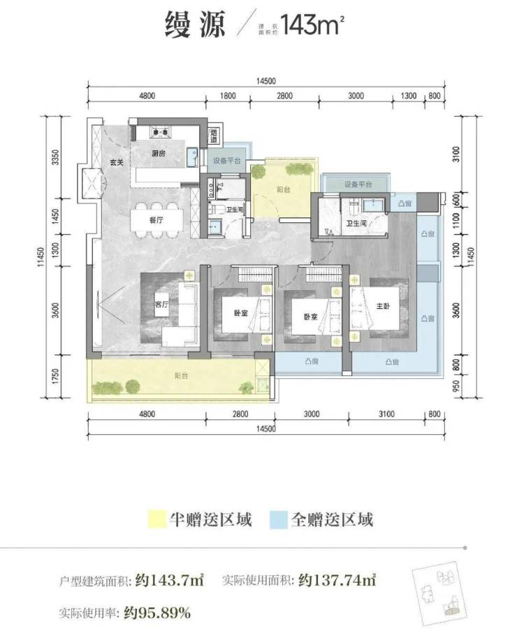 126㎡的4房2厅2卫,设计的是横厅南北通透格局,进门赠送约4.2㎡的入户玄关,客餐厅6.5米开间,主卧带设备平台,4个卧室分别做到了主卧22.5㎡/次卧10.97㎡/次卧10.5㎡/次卧7.38㎡(包含墙体飘窗),主卧+1个次卧270°飘窗,客厅连接次卧出6.25米长大阳台,L型厨房,得房率约103.5%(包含赠送),阳台主朝东南向。