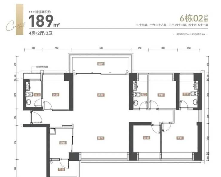 01户型142平4房2卫,02-03户型188平4房3卫,为楼王单位,层高3.15米,3梯3户。