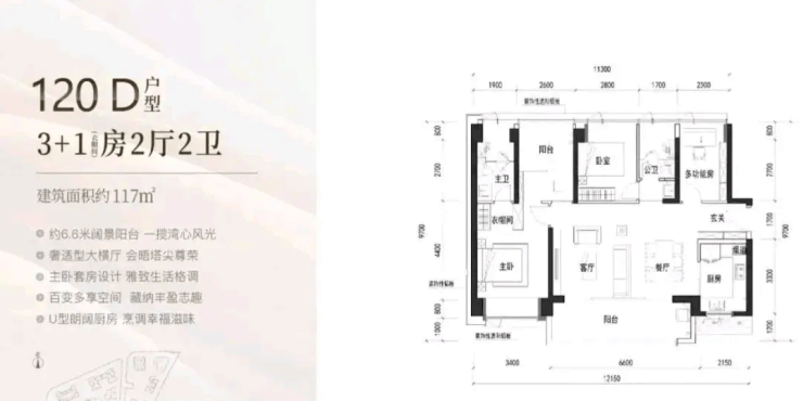 117㎡的4房2厅2卫,D户型(3栋2单元06户型),设计的是横厅南北通透格局,客餐厅6.6米开间,四开间朝南,4个卧室分别做到了主卧17.35㎡/次卧9.8㎡/次卧9.1㎡/次卧8.05㎡(包含墙体飘窗),客餐厅出6.6米长的宽景大阳台,U型厨房,公卫三段式分离,得房率约90%(包含赠送),西南朝向。