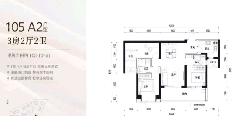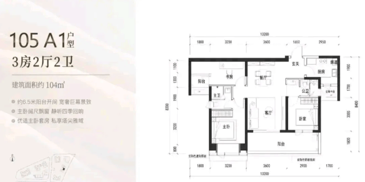 104㎡的3房2厅2卫,A1户型(2栋3单元03户型),设计的是竖厅类双龙抱珠格局,客厅3.6米开间,客餐厅一体化设计,3个卧室分别做到了主卧12.8㎡/次卧12㎡/次卧8.7㎡(包含墙体飘窗),客厅连接次卧出6.5米长的宽景大阳台,U型厨房,公卫三段式分离,得房率约90%(包含赠送),东南朝向。