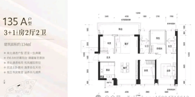 134㎡的4房2厅2卫,A户型(1栋1/2单元05户型),设计的是竖厅南北通透格局,进门入户玄关,客厅4.2米开间,LDKB一体化设计,四开间朝南,4个卧室分别做到了主卧19.44㎡/次卧10.64㎡/次卧10.26㎡/次卧7.8㎡(包含墙体飘窗),客厅连接次卧出6.8米长的观景大阳台看深大校区,U型厨房,卫生间干湿分离,得房率约90%(包含赠送),西北朝向。