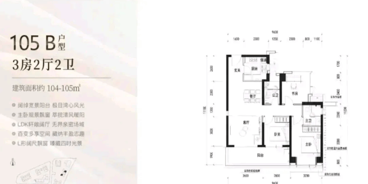 105㎡的3房2厅2卫,B户型(2栋3单元02/06户型),设计的是经典竖厅格局,客厅3.6米开间,LDKB一体化设计,三开间朝南,动静分区,3个卧室分别做到了主卧13.12㎡/次卧9.9㎡/次卧8.4㎡(包含墙体飘窗),客厅连接次卧出6.4米长的宽景大阳台,U型厨房,卫生间干湿分离,得房率约90%(包含赠送),正南或东南朝向。