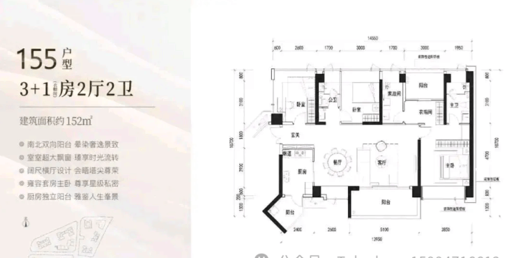 152㎡的4房2厅2卫,3栋2单元01户型,设计的是横厅南北通透格局,进门入户玄关,客餐厅7.7米开间,LDKB一体化设计,四开间朝南,4个卧室分别做到了主卧21.17㎡/次卧12.4㎡/次卧11.7㎡/次卧11.7㎡(包含墙体飘窗),客厅出5.1米长阳台,L型厨房带1个生活阳台,公卫三段式分离,得房率约90%(包含赠送),东南朝向。