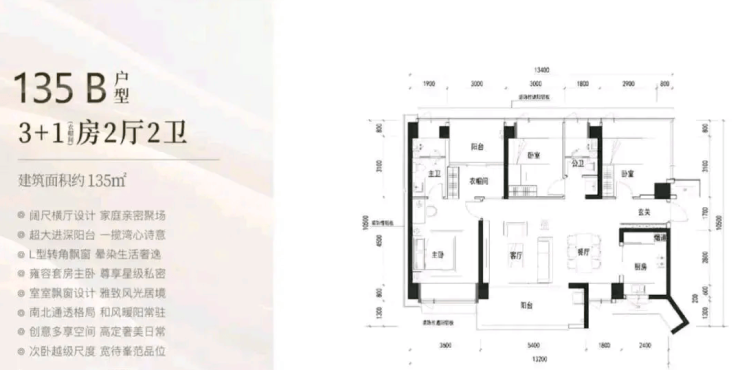135㎡的4房2厅2卫,B户型(2栋4单元06户型),设计的是横厅南北通透格局,进门入户玄关,客餐厅7.2米开间,LDKB一体化设计,四开间朝南,4个卧室分别做到了主卧19.08㎡/次卧14.3㎡/次卧11.7㎡/次卧11.7㎡(包含墙体飘窗),客厅连接次卧出6.8米长的观景大阳台看深大校区,U型厨房,卫生间干湿分离,得房率约90%(包含赠送),阳台主朝西南向。